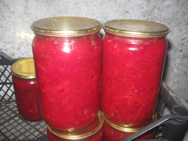 все режем и трем как на борщ и обжариваем на растительном масле, добавляем 3 литра томата или 4 пачки(по 150 гр) томатной пасты.....можно пополам паста+томат, тушим до готовгости свеклы, потом добавляем 100 грамм уксуса 9 %...тушим еще 5 мин и закладываем в стерильные банки и сразу закатываем.
