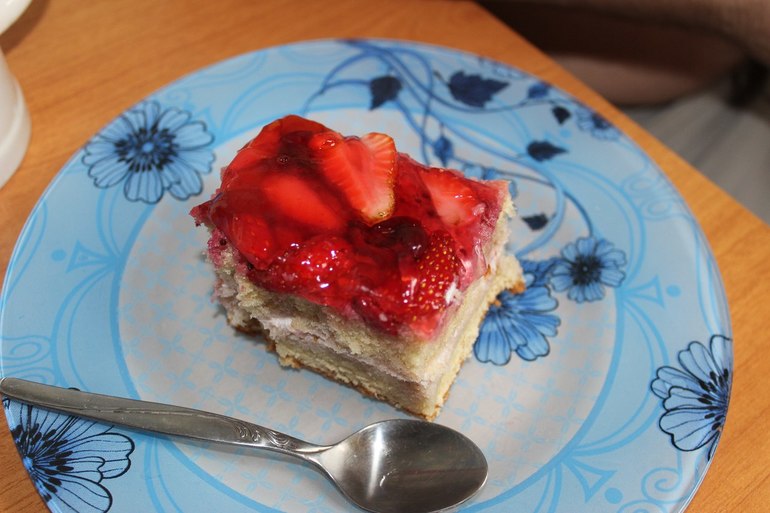 7) Разрезаем бисквит на 3 части,первую кладем на тарелку и пропитываем вареньем,и намазываем пышно кремом,кладем ягодки или фрукты нарезанные мелкими кусочками