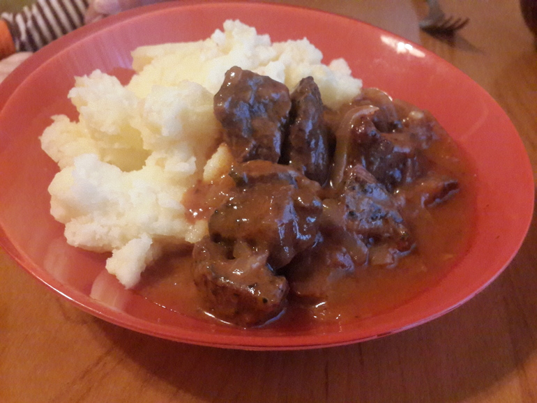 Нам понадобится: мясо, свинина или говядина 1 кг, 2-3 головки лука, не бойтесь переборщить, будет только вкуснее, 1 ст.ложка муки, 2 ст.ложки томатной пасты, 700 мл воды, подсолнечное масло, соль и специи по вкусу. Поехали!