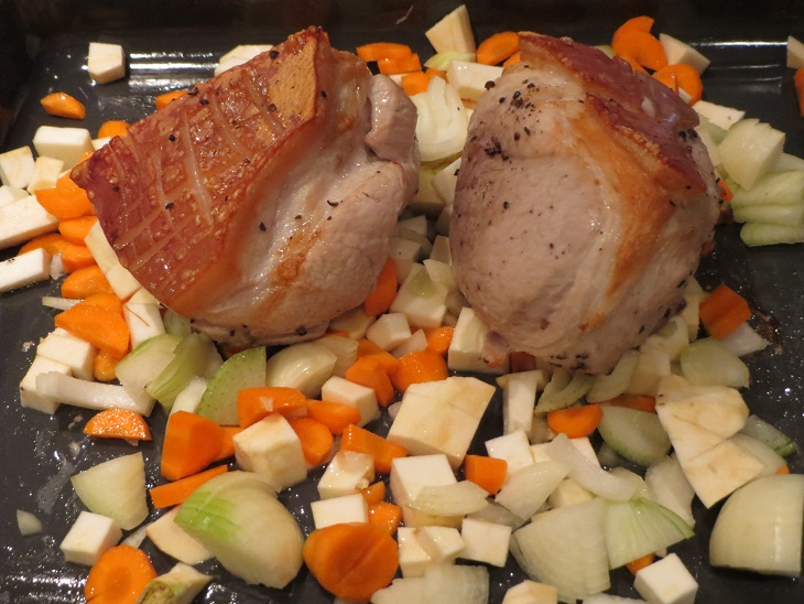 Лучше вот такая,не слишком толстая, потому что ,готовя второй раз я купила не в мясном магазине а в супермаркете с толстым слоем и муж сказал,что получился кусок намного суше,чем в первый раз.Покупается на человека примерно грамм 400 потому что оно при приготовлении очень сильно ужаривается.Натирается солью,перцем.Сначала минут тридцать в духовке на режиме гриль обжарить.Пока обжаривается ,я чищу и режу овощи (беру на глаз )В первый раз не знала и сельдерей взяла стебли,но перед приготвлением второй раз уточнила у немки,она и сказала что лучше корневой.