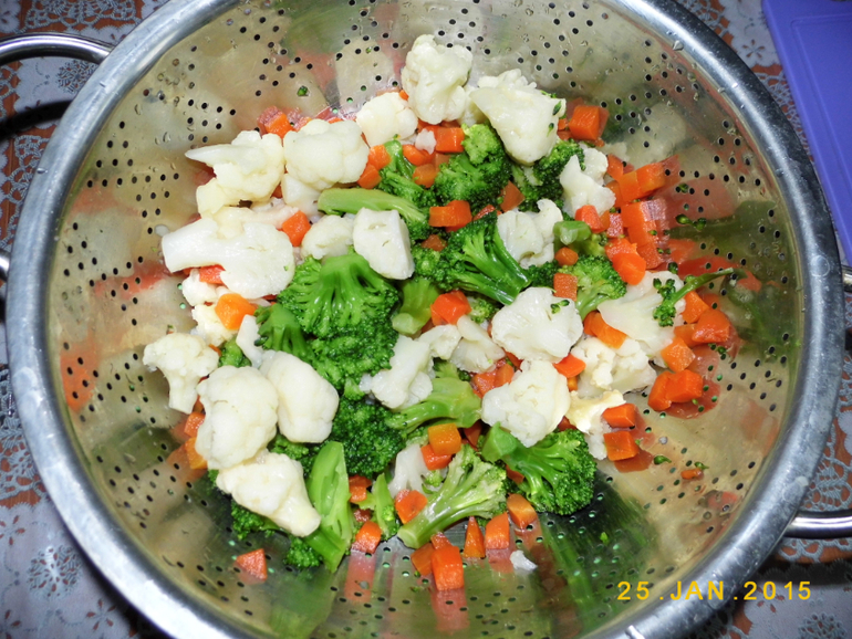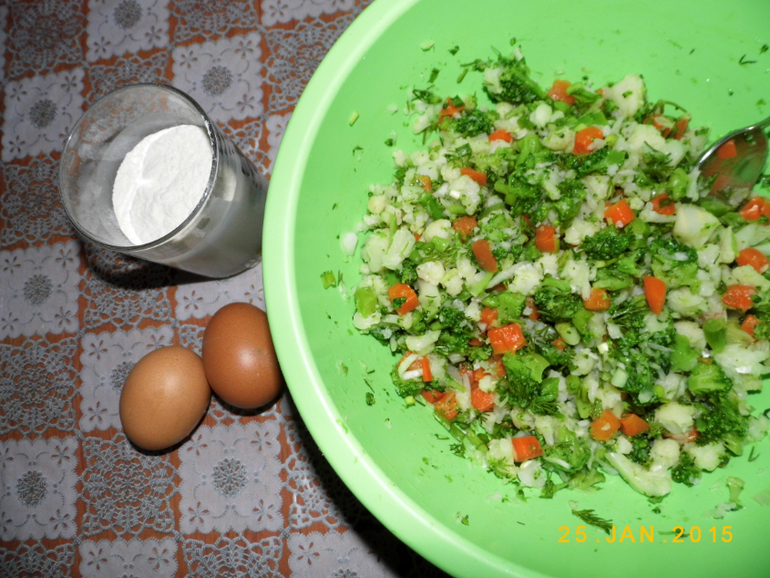 овощная смесь 2 уп по 400 гр (у меня цветная капуста,капуста брокколи, морковь.), лук репка 1шт, немного зелени(у меня зеленый лук и укроп(можно заменить сухими). оригано(сухая),яйцо 2 шт,мука пол стакана, соль перец по вкусу.