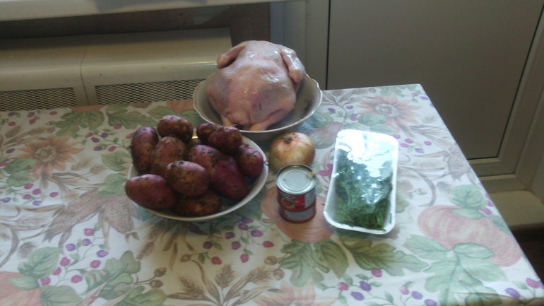 курица, картошка, лук, зелень, томатная паста, соль, перец, вода, приправы.