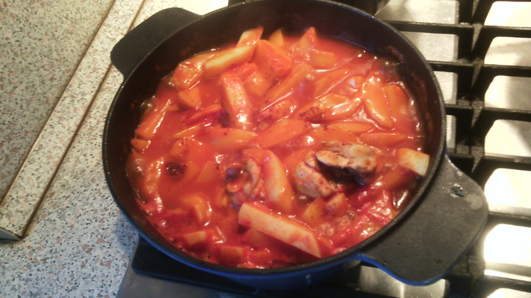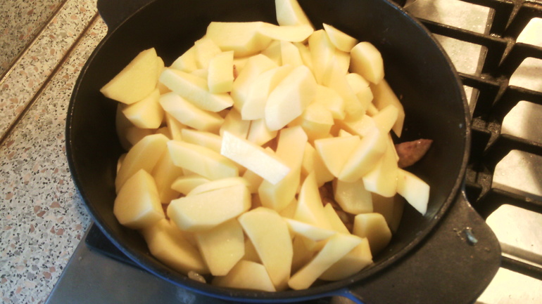 А пока чистим и режем картошку крупными кусочками. Пока чищу, как раз курица доходит до нужной кондиции.