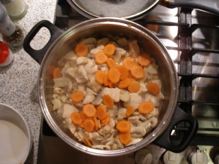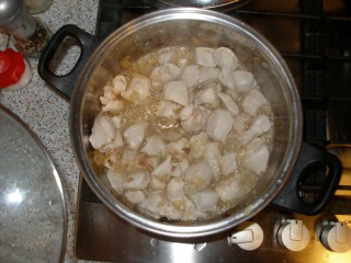 Лук режем чем мельче, тем лучше. Наливаем в кастрюлю немного масла, греем его, кидаем лук, ждем "золотистого" цвета. Приваливаем кусочки курицы. Накрываем крышкой. Режем грибы (если готовите без грибов, этот пункт пропустите).