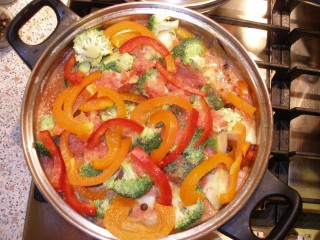 Все слоями вываливаем в кастрюлю, заливаем "помидорами", добавляем воды(так, чтобы на 2 пальца не доставало до верха овощей. (Но пальцами лучше не мерить!)