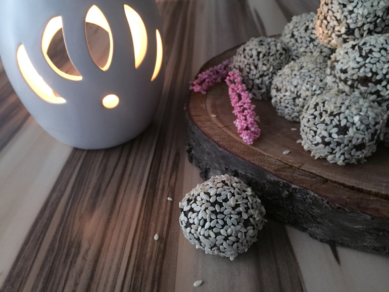 Все ингредиенты перемолоть блендером. Из массы формировать небольшие конфетки и обвалять в кунжуте. Чтоб масса сильно не липла к рукам - периодически мочите их в воде.