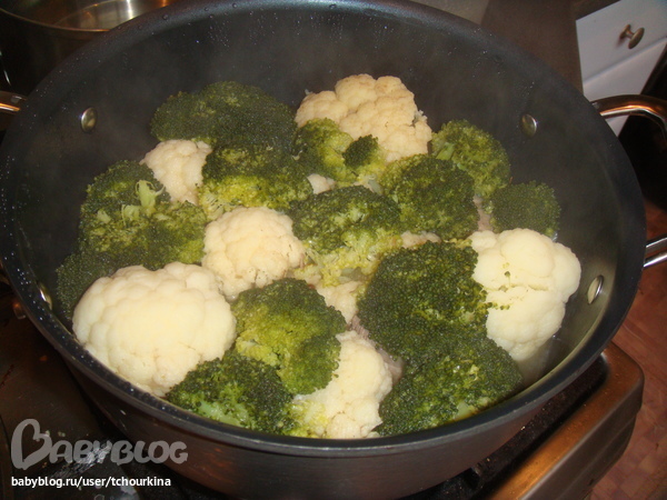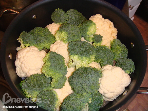За 15 минут до готовности положить в сотейник разобранные на кочешки цветную капусту и брокколи:
