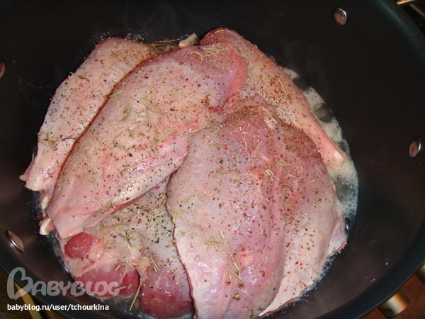 Филе индейки (у меня это филе голени без шкуры) посолить, посыпать смесью "5 перцев" и уложить в кипящую воду: