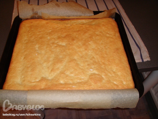 Переложить пласт вместе с бумагой на мокрое полотенце и все вместе свернуть в рулет, отложить до остывания: