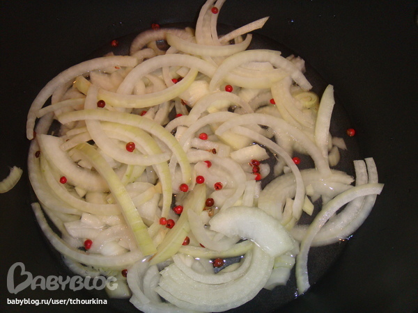 В сотейник влить стакан воды, положить лук, всыпать розмарин и розовый перец: