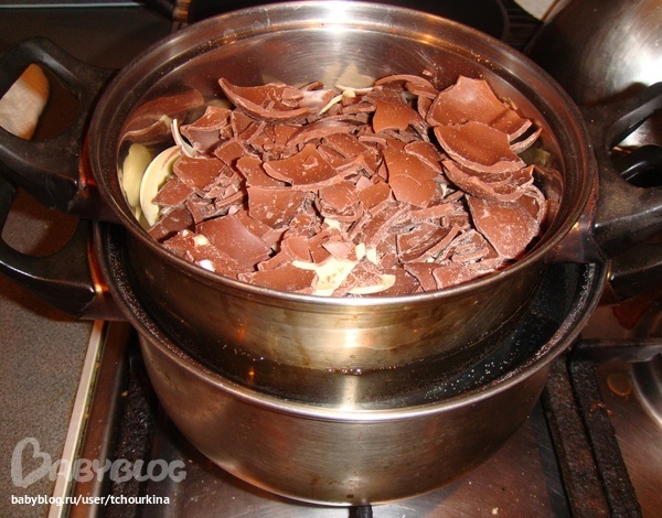 Мы покупаем много шоколадных яиц с игрушками, чтобы собрать коллекции смешариков, тачек и т.д. И вот пришло время пустить накопленный шоколад в ход. Поместили шоколад на водяную баню с 50 мл сливок: