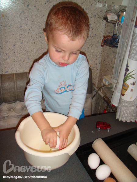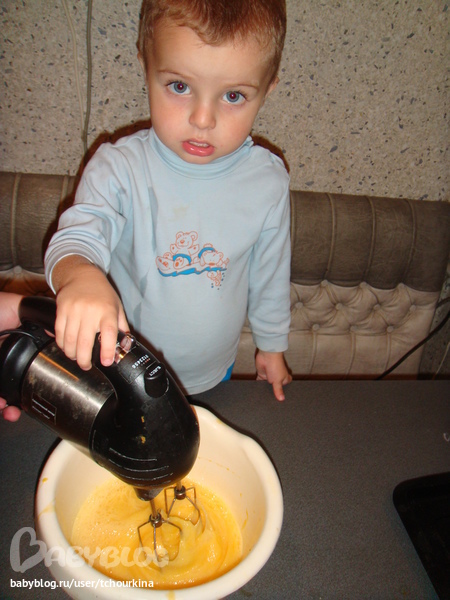 В это время сделать тесто. 3 яйца взбить с 1 стаканом сахара (именно этим Вова занимается на первом фото), добавить 100 г сметаны, 1 ч.л. разрыхлителя и 1,5 стакана муки.