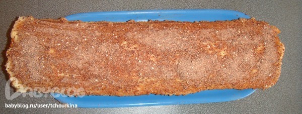 Смазать рулет не только внутри, но и снаружи, украсить (у меня - тертый шоколад):