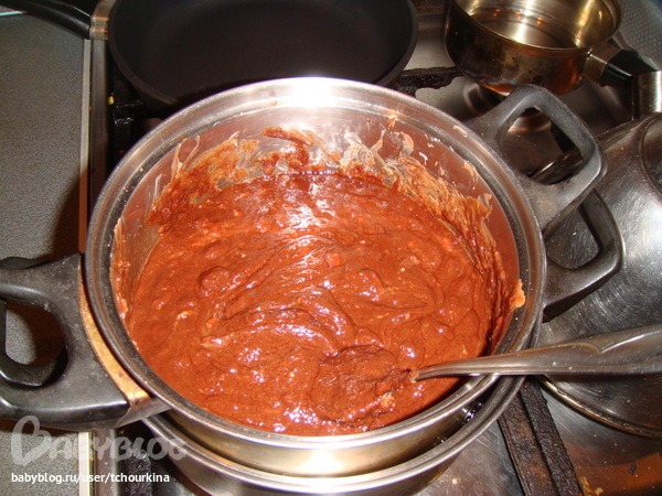 Вылить в них по 1 ст.л. теста, затем 1 ст.л. шоколада и еще раз тесто. Выпекать в духовке до золотистого цвета:
