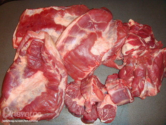 На этой неделе я побывала на рынке и купила около 8 кг парного мяса. Тут и говяжьи голяшки, и баранья нога, и свиная грудинка: