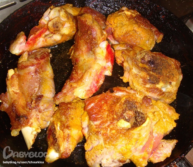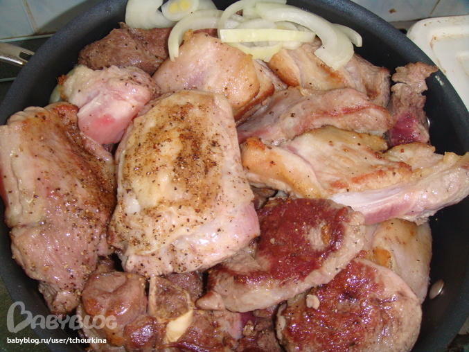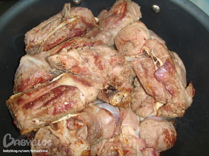 Третий слой в казане - обжаренные куски свинины: