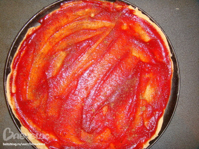 Раскатать тесто тонким пластом, смазать пицца-соусом или кетчупом, посыпать приправой для пиццы: