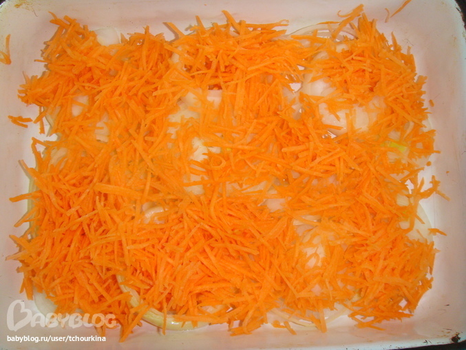 В емкости разложить много тонко нарезанного лука и мелко натертую морковь: