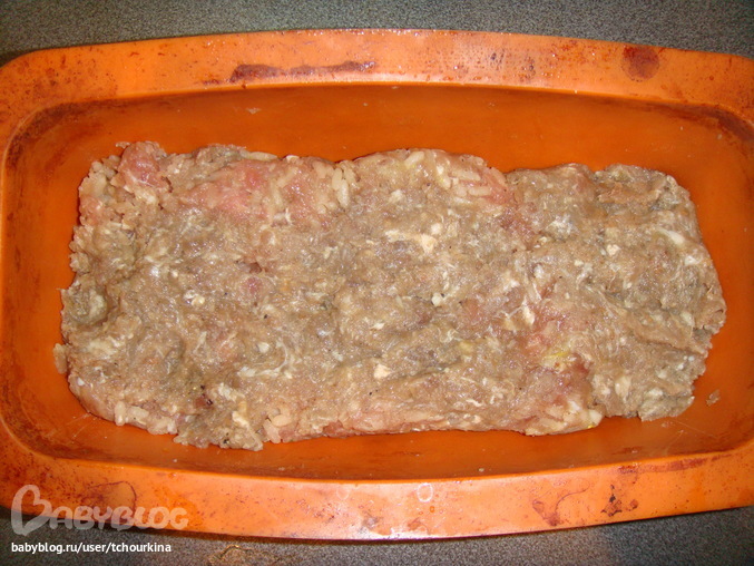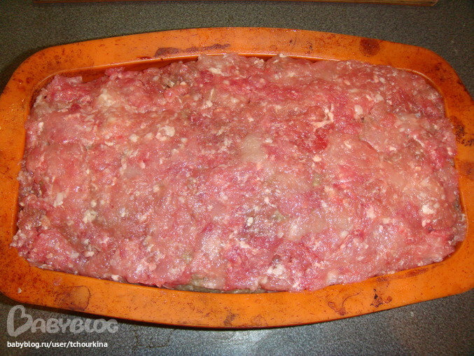 Обрезки свинины, говядины и маленькие кусочки баранины перемолола в фарш, посолила, поперчила, добавила разбитое яичко, разбавила холодной водой. В силиконовую форму в виде буханки выложила слой фарша в 2 см:
