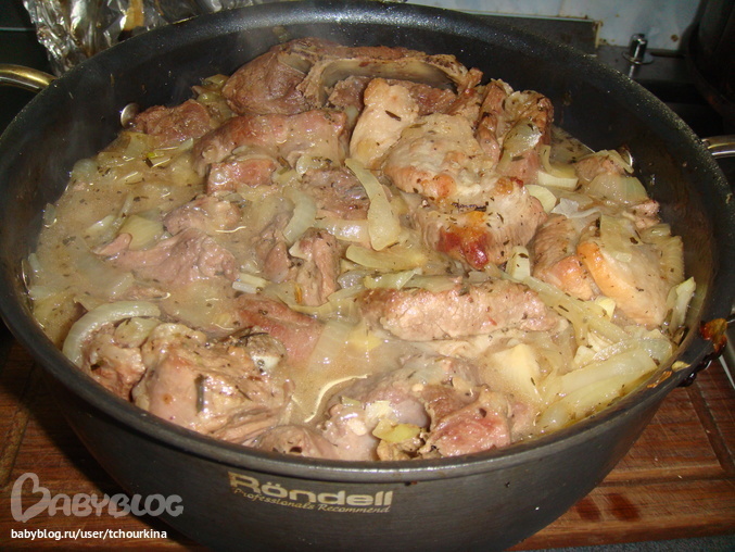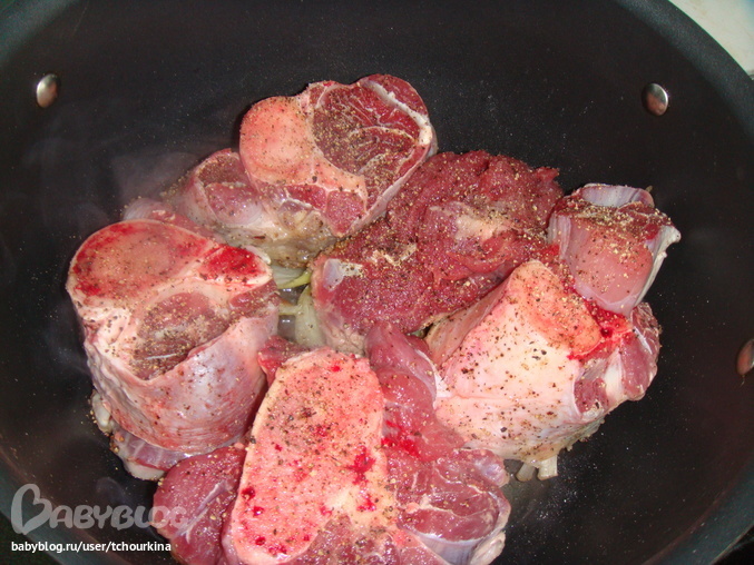 Положить в казан лук, черный перец горошком, влить немного воды, вскипяченной на сковороде с мясным соком. Закрыть фольгой и поставить на час в хорошо прогретую духовку: