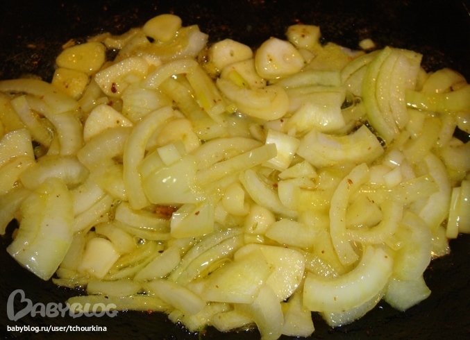 Переложить в кастрюлю и залить кипятком. А в сковороде с карри обжарить лук и чеснок, которые потом тоже положить в кастрюлю к мясу, посолить: