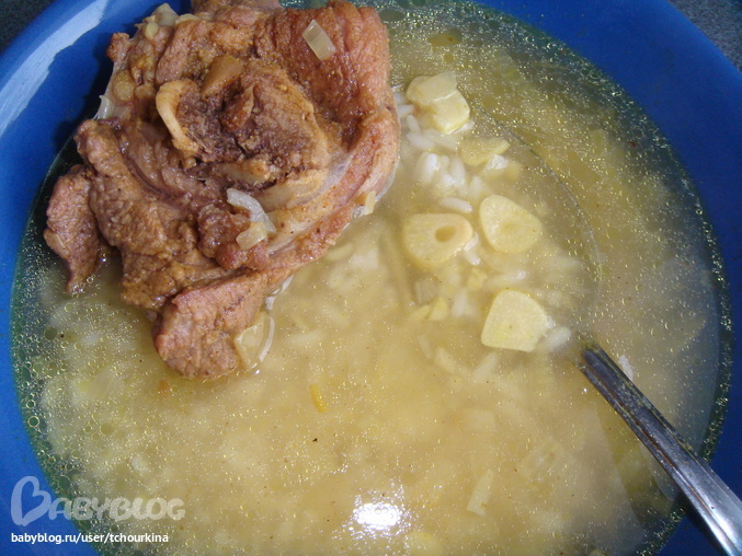 Варить до размягчения мяса. Отдельно сварить до готовности рис. Суп подают накладывая в тарелку 2 ложки отварного риса, 1 кусок мяса на кости и заливают бульоном. Суп совсем не острый, можно давать его деткам и очень красивый. Почему-то фотки не передают оранжевость его цвета!