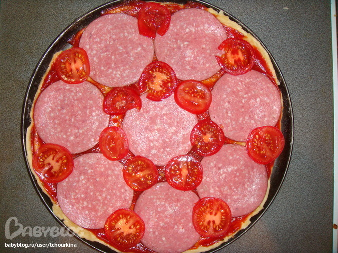Разложить салями и помидоры: