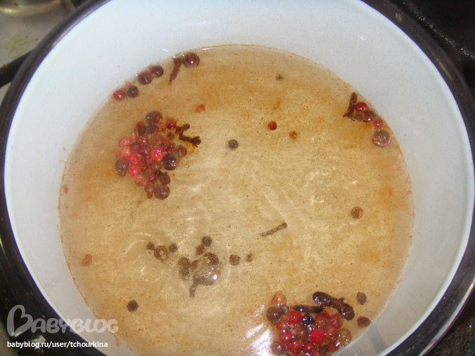 Залить подготовленным маринадом: пол литра воды, 1 ст.л. сахара, 1 ч.л. уксусной кислоты (70%), щепотка соли, 5 гвоздичин, 10 душистых перцев, розовый перец, паприка, 4 лаврика: