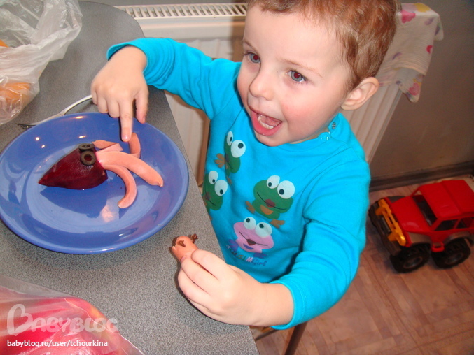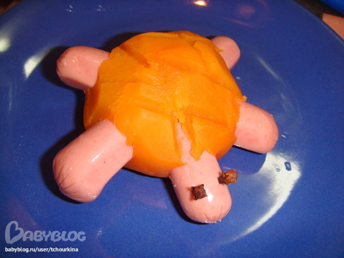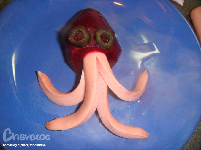 Ее можно делать из картошки, брокколи, репы. Вырезать 5 отверстий. Вставить половинки сосисек - ноги и еще кусочек с прорезанным ртом - голову с глазками из гвоздичин: