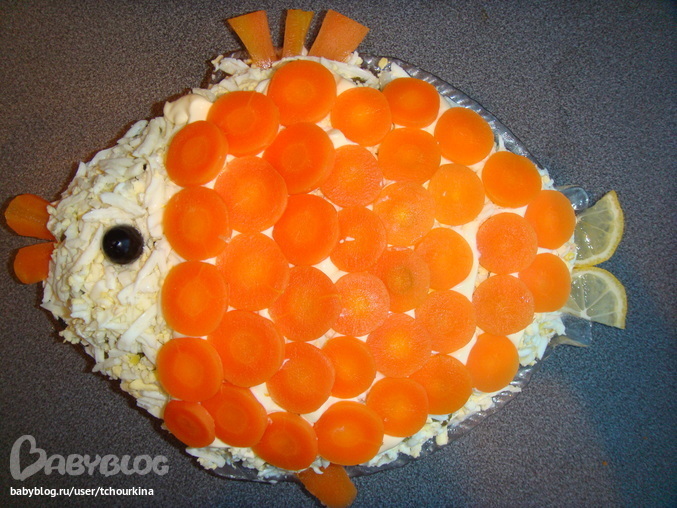 Отварную морковку почистить, нарезать на кружочки и выложить чешую. Сделать плавники, хвостик и глаз из маслины: