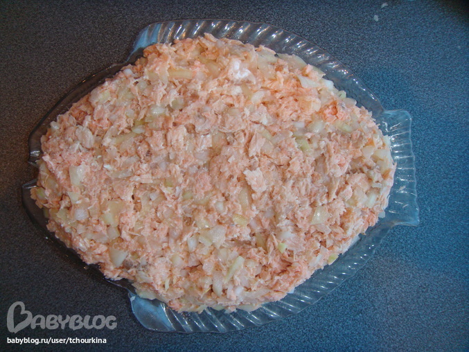 Лук отжать, отваренную рыбу разобрать и мякоть перемешать с луком. Выложить на блюде первый слой и залить майонезом: