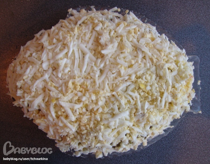 Последний слой - натертые на крупной терке вареные яйца и майонез:
