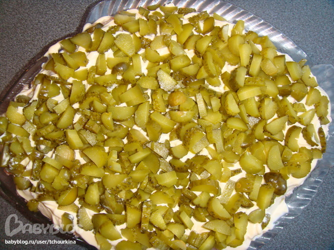 Второй слой- натертый на мелкой терке твердый сыр, третий слой - мелко порубленные маринованные огурчики и опять майонез: