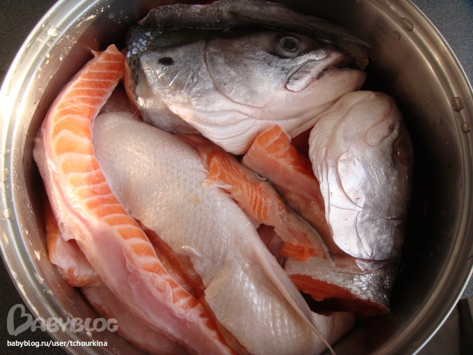 Остается голова, плавники, хвост и хребет. Конечно, можно из них сварить отличную уху! Но рыбу я покупаю часто, ухи столько не хочется. Да и еще одна голова от прошлой рыбы в морозилке лежала. Так что собрала я все отходы, залила водой и отварила с солью, перцем, лавриком: