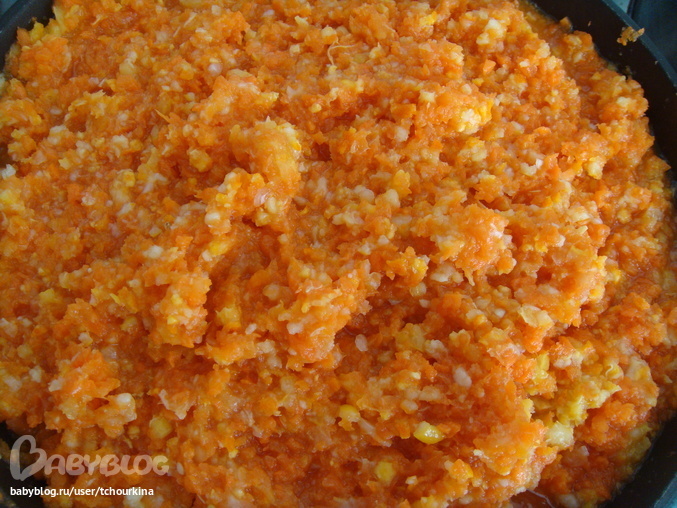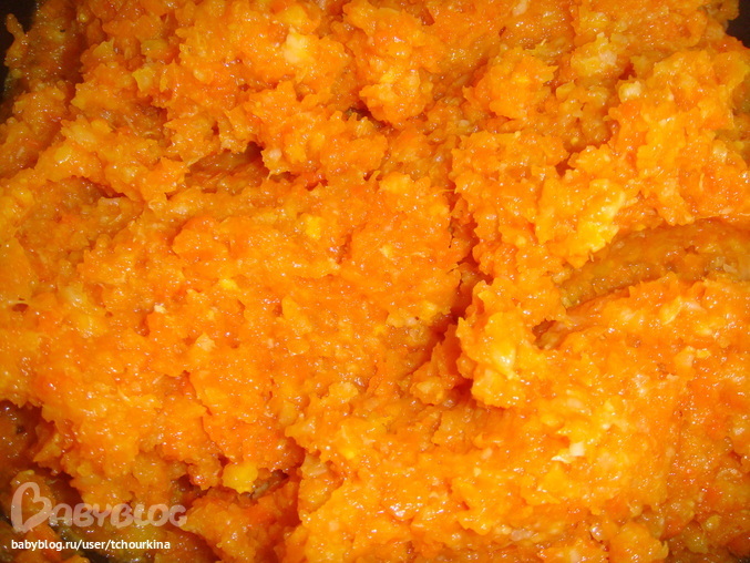 Нарезать, вынуть косточки и пропустить через мясорубку. Добавить вместе с соком в сковороду к морковке, перемешать и тушить до мягкости: