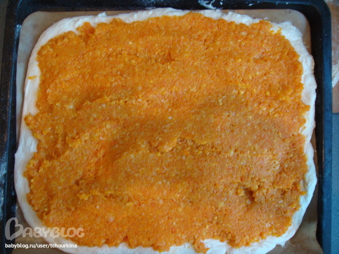 Подошедшее тесто разделить на 2 части: 1/3 и 2/3. Большую расть раскатать и разложить на противне. Выложить на нее всю начинку: