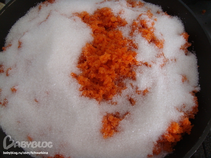 Прокрутить через мясорубку, добавить 0,5 стакана песка и потушить на сухой сковороде.