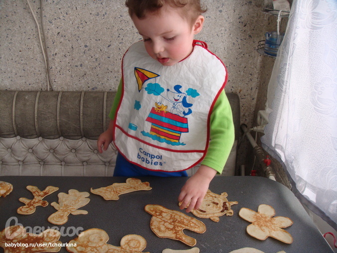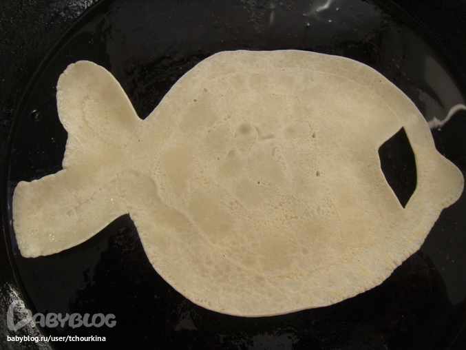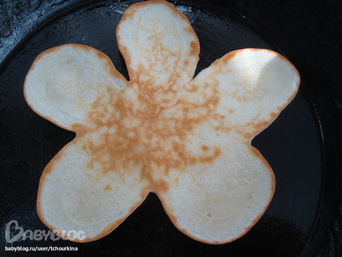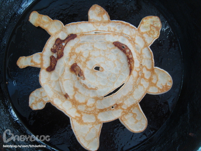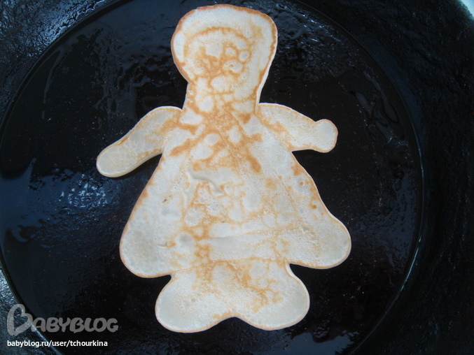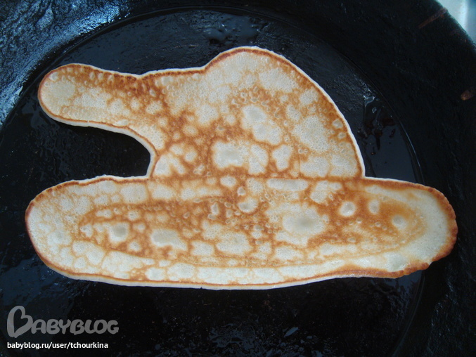 Перелить тесто в бутылку и нарисовать на смазанной сковороде фигурные блины. Мне порции хватило чтобы нарисовать Вовику вот это: