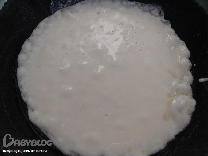 Использую для них семейный рецепт теста: размешать 2 яйца с 1 ст.л. сахара, щепоткой соли. Муки всыпать до густоты сметаны, затем разбавить пол литра сырого молока до жидкой консистенции (как кефир):