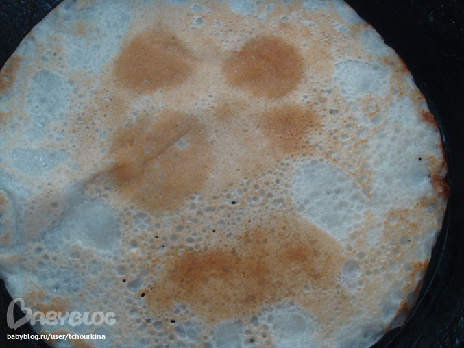 Получаются тонкие пористые блинчики, почему-то оранжеватого цвета: