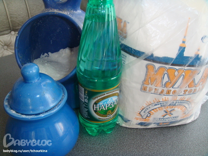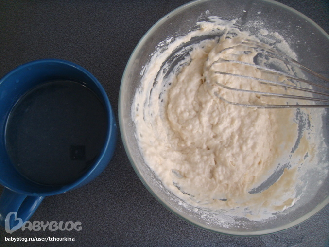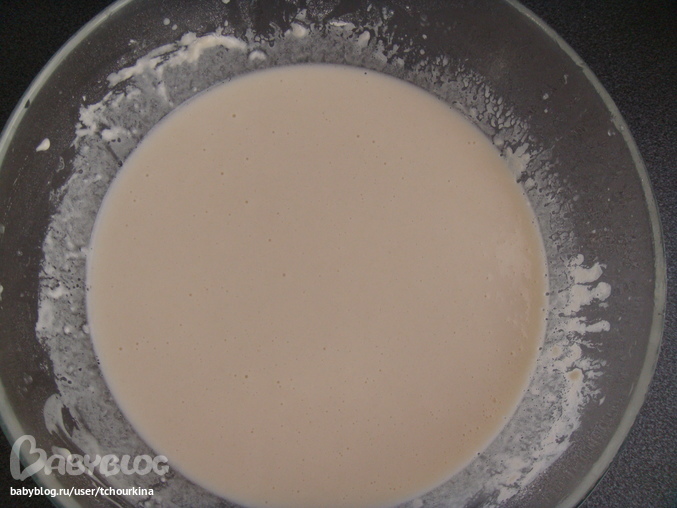 Постепенно вливать минеральную воду с газом до получения однородного теста консистенции жидкой сметаны: