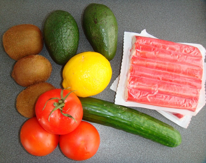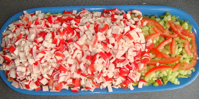 Залить салат заправкой (взбить венчиком сок 0,5 лимона с 50 г зеленого оливкового масла, щепоткой соли и черного молотого перца). Сверху посыпать нарезанными крабовыми палочками (для дочи-сыроедки оставила кусок салата без палочек::