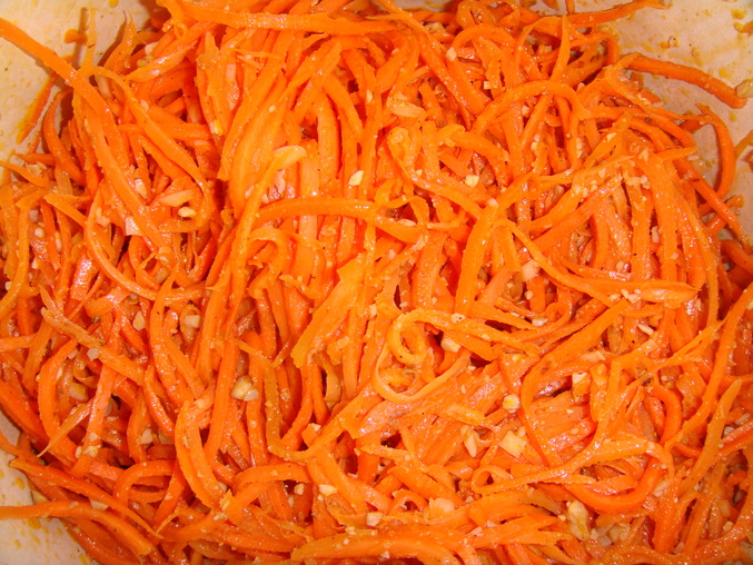 Это готовил зять по рецепту своей мамы. Натереть на корейской терке 1 кг сырой моркови: