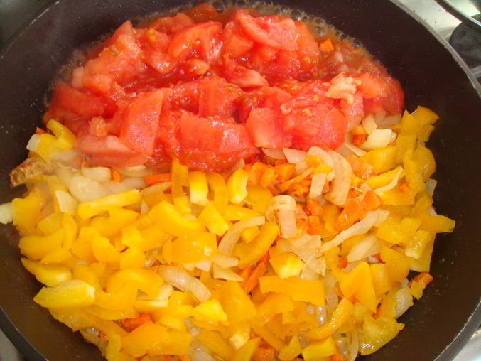 Сварить куриный бульон (можно использовать остатки крылышек или килевую кость от грудок). На сковороде спассеровать лук, морковь, затем добавить ошпаренные помидоры без кожицы и болгарский перец (я использовала остатки от пчелок):