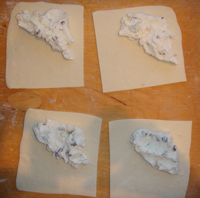 Слоеное бездрожжевое тесто немного раскатать, нарезать на квадраты, разложить начинку: