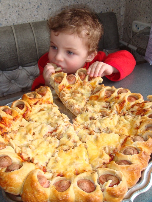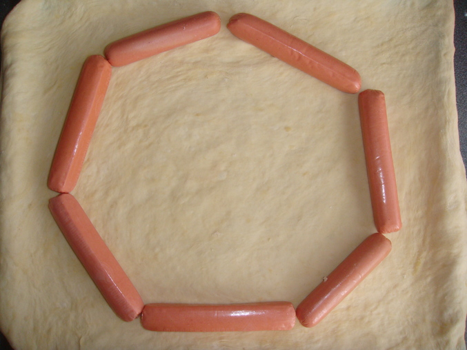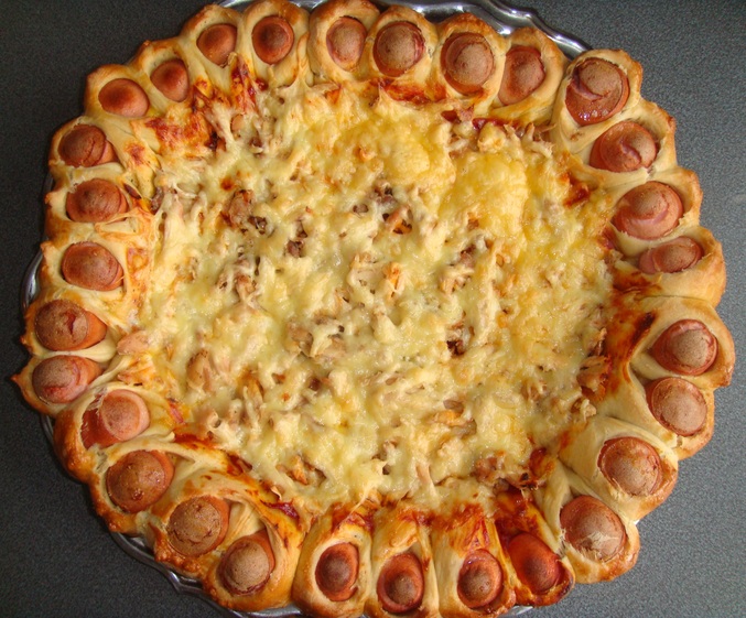 Для теста смешать 2 чашки теплой воды с 1 чашкой зеленого оливкового масла, добавить соль, дрожжи, муку и замесить эластичное тесто. Раскатать тесто тонким пластом и положить на противень так, чтобы свисали края. Выложить по кругу сосиски: