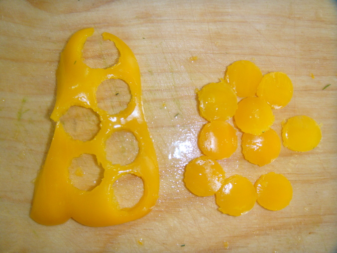 Нарезать кружками черные оливки и вырезать такие же кружки из желтого перца: