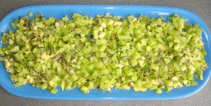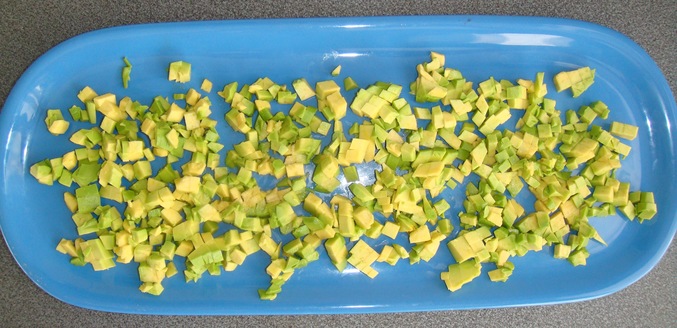 Авокадо почистить, нарезать мелкими кубиками, выложить первым слоем на плоском блюде: