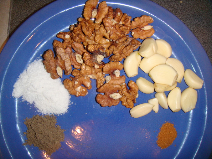 Влить 5 ст.л. уксуса и пол стакана растительного масла. Добавить 10 рубленных грецких орехов, 1 головку мелко натертого чеснока,1 ч.л. черного молотого перца, немного красного перца, 1 ч.л. соли: