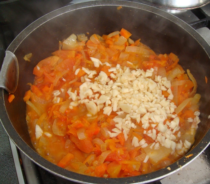Тушить до мягкости, затем добавить мелко рубленные 4 зубчика чеснока:
